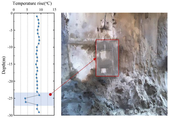 The distributed optical fiber field test shows that the temperature variation was small in temperature at depths of 0–24 m of the foundation pit, and was within 7.5–10 °C. The temperature dropped significantly at depths of 24–27 m. After analyzing the causes of abnormal temperature, it was pointed out that there may be leakage points in this range. Subsequent excavation verifies that there is a water seepage point in the water stop curtain of the foundation pit. The water leakage point is located at the excavation depth of 25 m of the foundation pit, as shown in Figure 3.