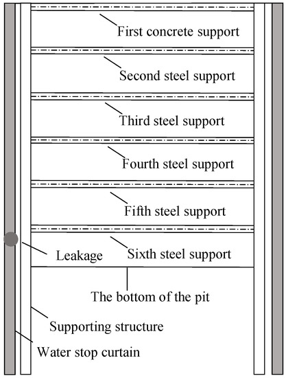 With the rapid development of urban underground space engineering, foundation pits become bigger, deeper, and closer. The disasters caused by foundation pit engineering increases correspondingly, especially in areas rich in groundwater. Many practical projects show that the leakage of the deep pit retaining structure is the main factor causing large deformation or cracking around the foundation pit [1,2,3], as shown in Table 1 and Table 2. Therefore, it is necessary to analyze the deformation characteristics of the retaining structure and soil when the retaining structure leaks in the water-rich area, so as to ensure the safety of foundation pit engineering and surrounding building. The groundwater in the research area of this paper is relatively rich and is mainly divided into quaternary pressurized water and bedrock fracture water. The preliminary geological survey shows that the geology of this area is complex; the weathering of the rock body is serious; and the tectonic joint and fracture are very developed, indicating a secondary geological structure.