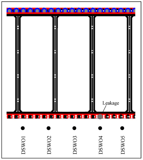 In order to monitor the change of groundwater level near the seepage point in real time and verify the reasonableness of the calculation and analysis results, groundwater level monitoring points (DSW01-DSW05) were set near the pre-detected seepage point before the excavation of the foundation pit. The internal support structure and water level monitoring system are shown in Figure 4 and Figure 5, respectively. The foundation pit adopted a retaining pile, the envelope adopted a rotary jet pile. The concrete material was used retaining pile and envelope. Water level monitoring points were spaced 5 m apart.