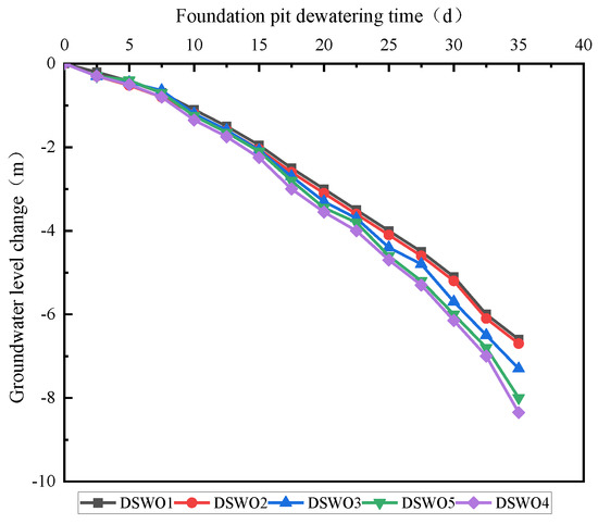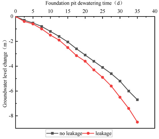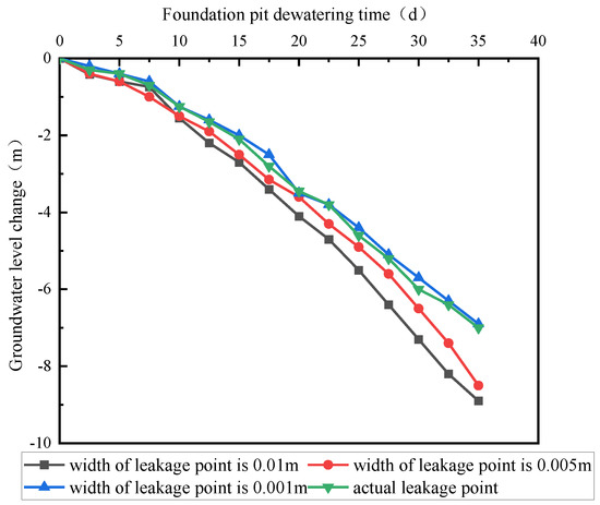 Long-term monitoring of groundwater level was carried out during the excavation of the foundation pit, and the change of groundwater level near the leakage point is shown in Figure 6. Due to the existence of the water curtain leakage point, the water level at the leakage point is about 1–2 m lower than that in other parts.