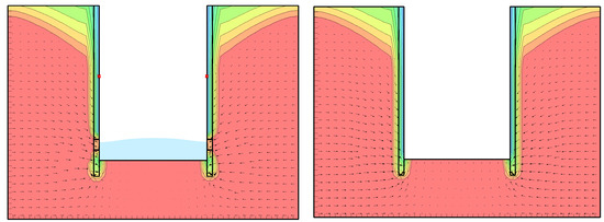 Underground flow path diagram of retaining structure with leakage (left) and without leakage (right).