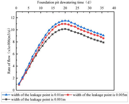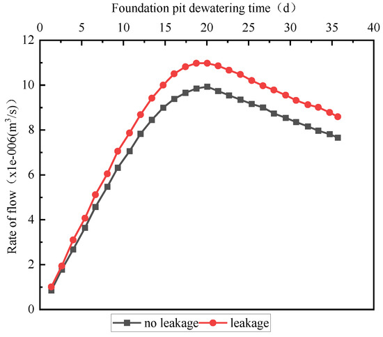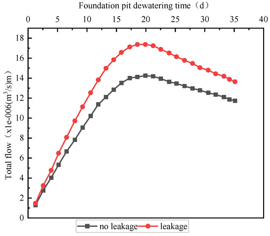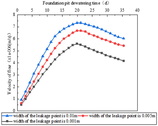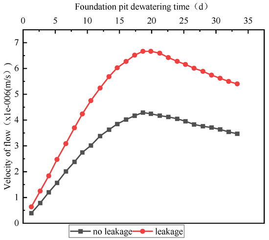 As can be seen from Figure 8, Figure 9, Figure 10 and Figure 11, when there is leakage in the envelope, the groundwater flow through the leakage is larger than that through the bottom of the envelope. The water flow through the leakage increases with the increase of the leakage size. The total groundwater flow into the foundation pit through the bottom of the retaining structure and the leakage is greater than the total flow into the foundation pit through the bottom of the retaining structure without leakage. In addition, the water level drop of the retaining structure with leakage is 2–3 m more than that of the retaining structure without leakage, which will promote the effective stress change of the soil around the foundation pit, and enhance the adverse impact on the surrounding environment. When the seepage is intense, a large seepage force is generated, and the water pressure at the seepage point is greater than that of the nearby part without leakage. The reason is that when there is a leakage point in the retaining structure, the difference of water head inside and outside the pit will become larger. With the water head difference, the water outside the pit overcomes the viscous resistance of soil particles and flows into the foundation pit, resulting in greater water pressure. In other words, when leakage of palisade structure exists, with the increase of leakage point flow field, water poured into the foundation pit will continue to increase, and the underground water level of the retaining structure outside the foundation pit will gradually decline. Therefore, in the process of the excavation of the foundation pit, precipitation leakage of the retaining structure produces unfavorable impacts on surrounding buildings.