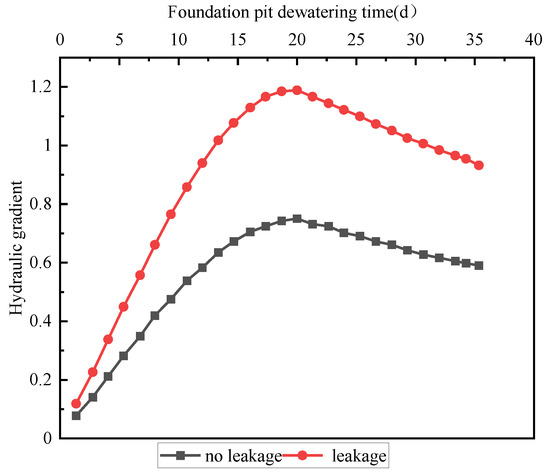 The diagram of the hydraulic gradient with precipitation time of the envelope with and without leakage.