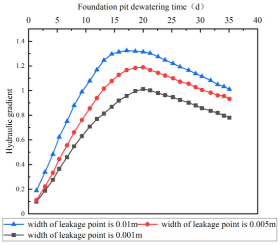 The curve of the hydraulic gradient with precipitation time at the leakage with different sizes.
