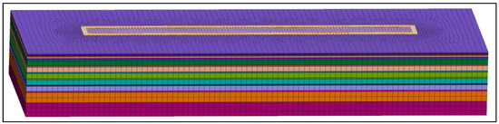 The finite element software GTS Midas (Developed by MIDAS IT) was used to establish the numerical calculation model of soil-envelope interaction of the foundation pit considering leakage and not considering the action. The excavation depth of the foundation pit was taken to be 29 m and the pit size was 21 m × 250 m. Four models with different leakage sizes (without leakage point, leakage point width 0.01 m, leakage point width 0.005 m, leakage point width 0.001 m) were established. For the concrete material, a linear elastic model was used, and a Mohr-Coulomb model was used for each layer of soil. The influence of the soil layers on the deformation of the foundation pit was analyzed using solid unit action mainly from two aspects: the horizontal displacement of the enclosure structure and the ground settlement around the foundation pit. The finite element model diagram is shown in Figure 17.