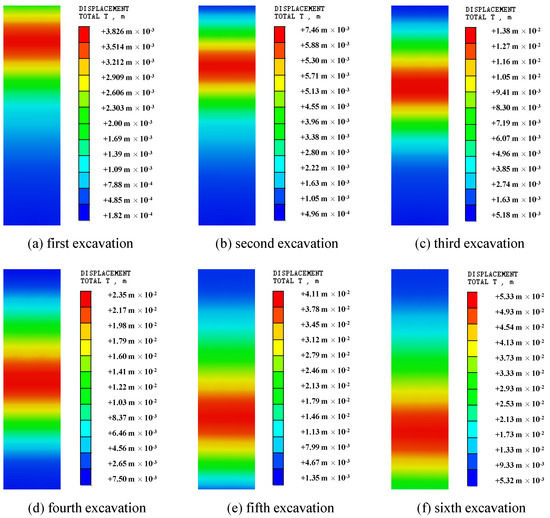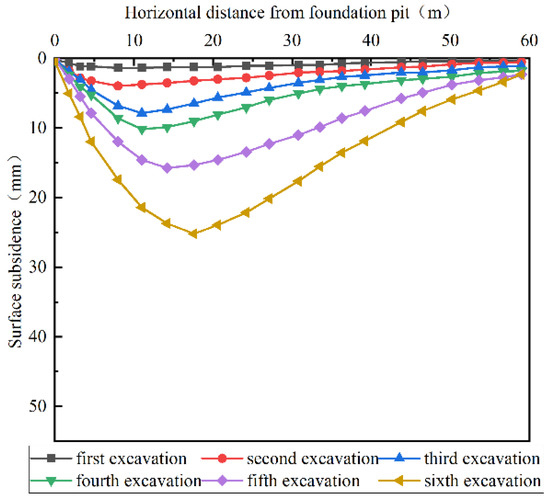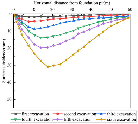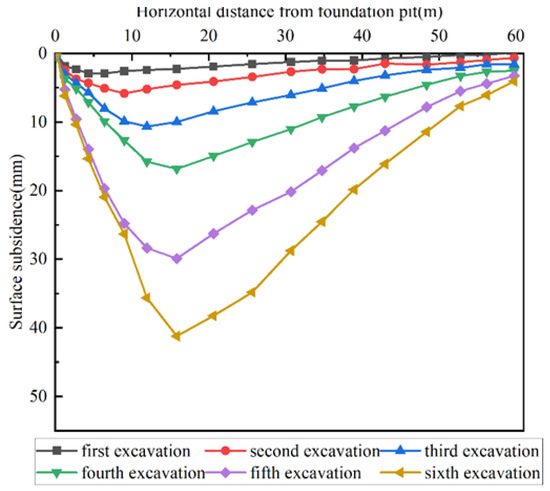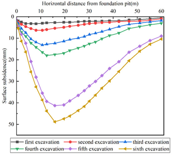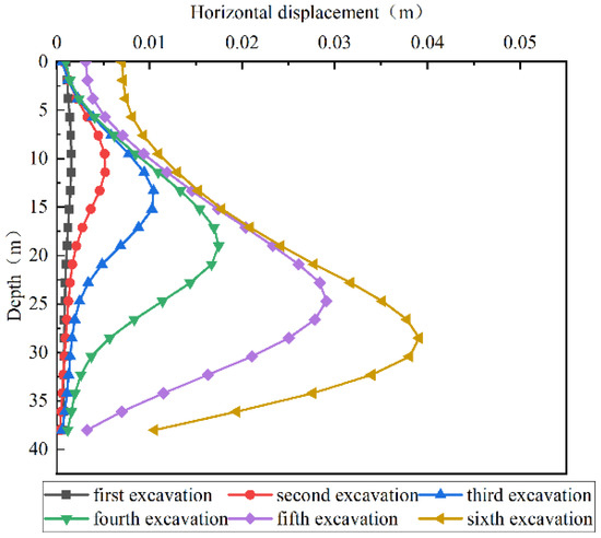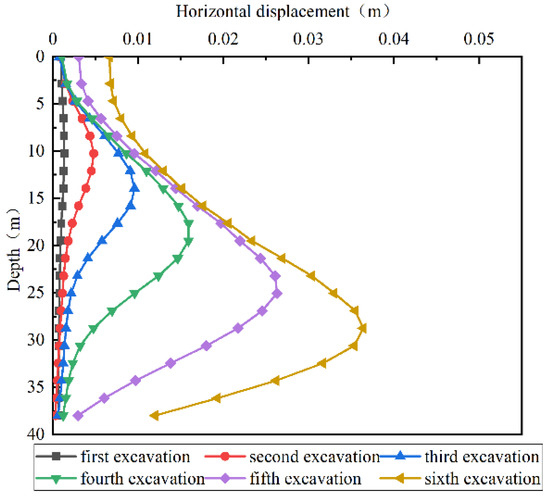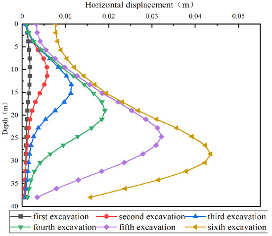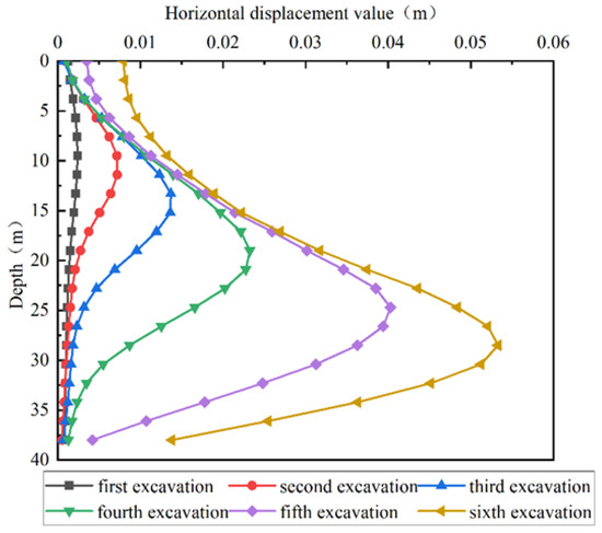 It can be seen from Figure 18 that the maximum horizontal displacement of the enclosure structure is increasing during the construction of the foundation pit, and the maximum value is 3.8 mm in the first excavation, 7.4 mm in the second excavation, 13.8 mm in the fourth excavation, 23.5 mm in the fourth excavation, 41.2 mm in the fifth excavation, and 53.3 mm in the sixth excavation. The horizontal displacement of the enclosure structure was not obvious in the first excavation, and the maximum horizontal displacement of the enclosure structure increased significantly with excavation times. The location of maximum deformation gradually moved down with the excavation. After the excavation was completed, the maximum horizontal deformation was located at about 0.9 times the depth of the pit, near the bottom of the pit.