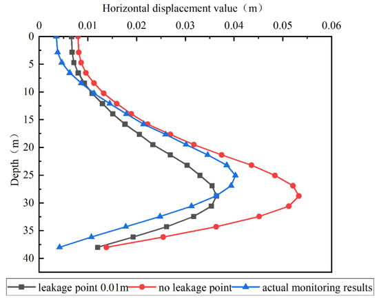 From Figure 19, Figure 20, Figure 21 and Figure 22, it can be seen that there are differences in the values of horizontal displacement of the enclosure structure with and without a leakage point in the construction process of the foundation pit. The maximum horizontal displacements of the enclosure structure are 36.1 mm, 39.1 mm, and 43.5 mm when the leakage point is 0.01 m wide, 0.005 m wide, and 0.001 m wide, respectively, and the maximum horizontal displacement was 53.3 mm when there is no leakage point. The overall deformation trend is consistent, and the curves are bell-shaped with small values at both ends and large values in the middle.