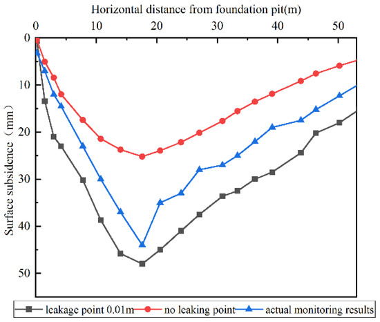 Although the overall trend is the same when there is a leakage point in the enclosure structure and when there is no leakage point, the surface settlement range of the pit increases with the increase of the leakage point. This will cause more damage to the surrounding buildings and will lead to irreversible accidents without in-time treatment.