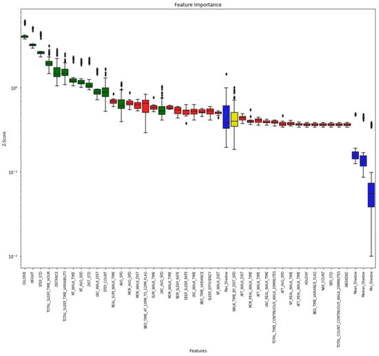 As shown in Figure 2, most of the sleep variables in the variable list extracted using BorutaSHAP, except for the total number of hours of sleep per day, are in red and do not significantly influence the generation of rules related to BMI prediction. These steps can directly affect BMI. Most of the variables are green and can be identified as primary variables. In addition, height, which is very closely related to BMI, was also identified as a significant variable. The four blue boxes represent the minimum, median, mean, and maximum attributes. The yellow box means tentative, the importance of which is difficult to determine. The reason is that this corresponding provisional attribute appears near the maximum attribute, which is challenging to identify in the basic random forest execution of the Boruta algorithm.