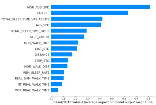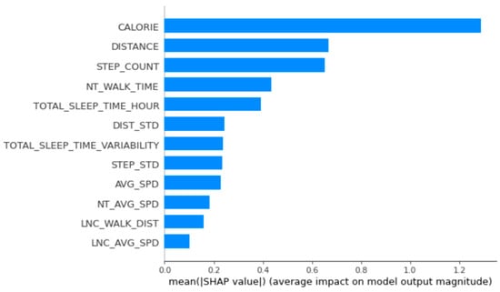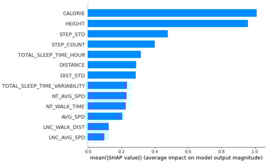 Figure 2 shows the feature importance obtained by the BorutaSHAP method for all data. The following features were selected: AVG_SPD, DIST_STD, DISTANCE, LNC_AVG_SPD, TOTAL_SLEEP_TIME_HOUR, STEP_COUNT, CALORIE, NT_AVG_SPD, LNC_WALK_DIST, NT_WALK_TIME, TOTAL_SLEEP_TIME_VARIABILITY, HEIGHT, and STEP_STD.