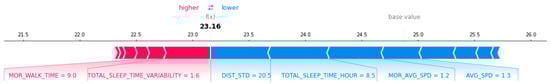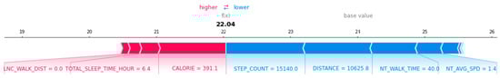 For the local interpretation of arbitrary data, the SHAP force plot was used. For the women in group 1, the number of steps, distance walked, amount of time walking at night, and average walking speed at night influenced lowering BMI. In contrast, calories and total sleep time affected increasing BMI (Figure 6).