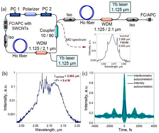 (a) Experimental setup of the all-fiber Holmium MOPA system operating in the ultrashort pulsed mode: WDM—wavelength division multiplexer, Iso—isolator, SWCNTs—single-walled carbon nanotubes, PC 1,2—polarization controllers; the output spectrum of Ho-doped fiber laser is presented on the inset (MO spectrum); (b) Lasing spectrum and (c) autocorrelation trace of the output pulse corresponding to the average output power of 0.4 W.