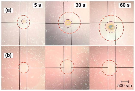 Figure 3a shows microphotographs of the porcine longissimus muscle tissue surface immediately after exposure of ultrashort pulsed radiation. For comparison, Figure 3b shows microphotographs after CW radiation action with the same power of 0.3 W. At the beginning of the exposure, the tissue surface is heated, which is accompanied by a change in the tissue color. Over time, the area of elevated temperature increases from the center to the periphery, forming a heat-affected zone (HAZ). In Figure 3, the edges of this zone are marked with a red line. The longer exposure time induces the evaporation of water contained in the near-surface tissue layers. As a result, an ablative crater (yellow line) can be observed in the center of the laser spot. Further impact causes tissue darkening around the crater and its carbonization. During the exposure, we could clearly hear clicks, which can be attributed to the characteristic sound of steam bubbles collapsing. The existence of collapsing bubbles may indicate the occurrence of cavitation effects during the action of pulsed radiation. The bubbles’ collapse could lead to tissue bursting and integrity disruption. The stress waves generated by pulsed laser radiation in absorbing materials, such as biological tissues, are due to the thermo-elastic effect [45]. Caused by the rapid temperature increase at the laser beam focus, thermoelastic stresses lead to maximum pressure increase in a finite volume of material [29]. For example, temperature rising at a wavelength of 0.8 µm and pulse duration of about 100 fs occurs over times of the order of several picoseconds, which is insufficient for acoustic relaxation [29,46]. Experimental investigation of cavitation bubble formation and its theoretical background by G. Paltauf et al. has shown that the photoacoustic damage mechanism should be especially taken into account when describing ultrashort pulsed laser radiation exposure to biological objects [47]. The reason is that the finite-size absorbing material volume experiences tensile stresses under the action of laser radiation, which leads to cavitation within the material and photomechanical damage [47]. In [48,49], it was shown that decreasing the pulse duration to picoseconds and femtoseconds values minimizes the thermal effects. Therefore, there is a decrease in the threshold energy for the optical breakdown (Eth~).