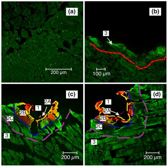 Section of porcine longissimus muscle tissue (a) before exposure; and after 30 s exposure by Ho-doped fiber laser systems operating in (b) CW mode with a power of 0.3 W (applied energy of 9 J) [41]; (c) USP mode with a power of 0.3 W (applied energy of 9 J); (d) CW mode with a power of 0.5 W (applied energy of 15 J) [41]. 1—Ablation zone (AZ), 2—Coagulation zone (CZ) with the elements of the coagulation crust and fragmentary charring, 3—Heat-affected zone (HAZ).