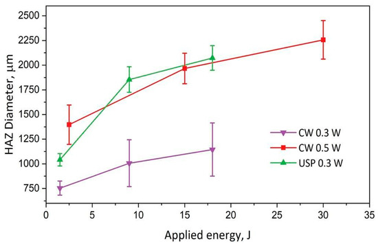 Dependency diagram of the heat-affected zone (HAZ) diameter on the applied energy of USP and CW laser radiation for different exposure times (5, 30 and 60 s).