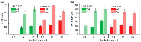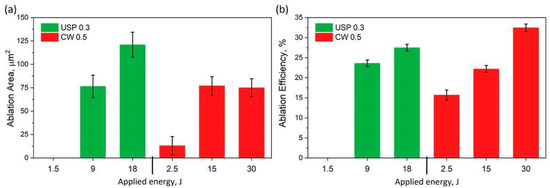 (a) Ablation area and (b) ablation efficiency as a function of applied energy of USP and CW laser radiation for different times of exposure (5, 30 and 60 s) and laser power (0.3 W, 0.5 W), shown as applied energy.