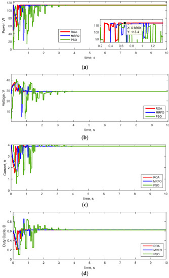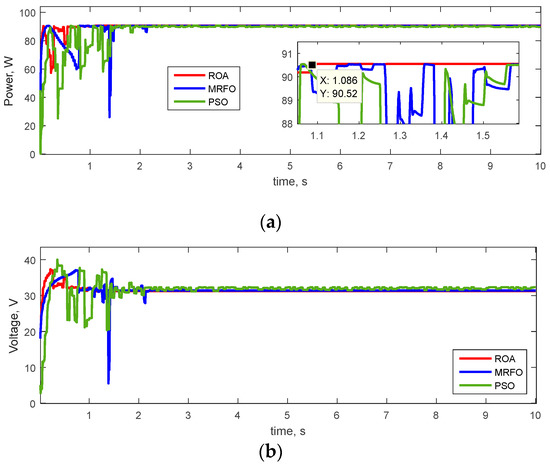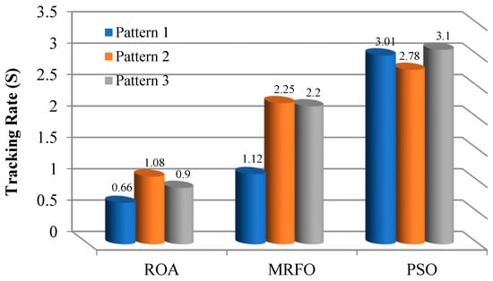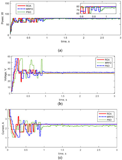 - The ROA extracted more PV maximum power in all patterns than the MRFO and PSO methods. The PSO algorithm is an optimization method that may be involved in premature convergence and trapped with a local optimal solution in solving the optimization problem. The random selection of reference points in the early iterations weakens the exploitation capability of MRFO. Furthermore, hain foraging tends to lead the algorithm into local optimum. However, the ROA has high exploitative, exploratory, and local optimal avoidance capabilities. Therefore, these cases increase the accuracy of tracking and reduce state steady errors in a shorter time than other methods. The above cases are the reasons for the superiority of the ROA over other methods.