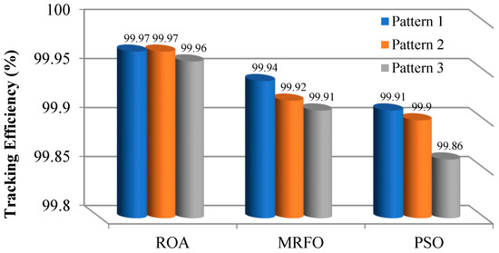 - The ROA with highly competitive capability has been able to solve the PV MPPT problem for different patterns with higher efficiency and tracking rate.