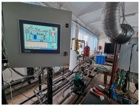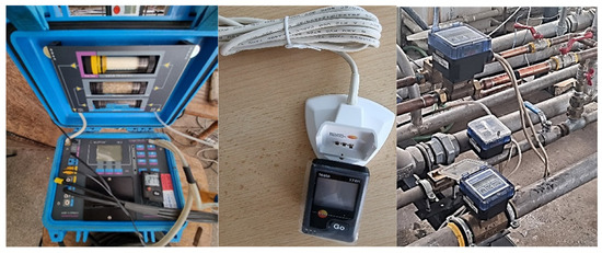 In order to monitor the flue gases temperature, the quality of combustion, and also air temperatures and humidity in the endowment of the laboratory, a portable gas analyzer and portable thermo-anemometers (temperature range −20–60 °C, precision ±0.1 °C) are used. The water volumetric flow is measured with propeller flow meters (precision ±1% of the measured value)—Figure 2.