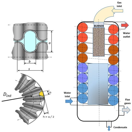 The specific geometry of the corrugated pipes condensing boiler is presented in Figure 3, along with the main flow specific geometries for the flue gases (critical for determining the heat and mass transfer conditions).