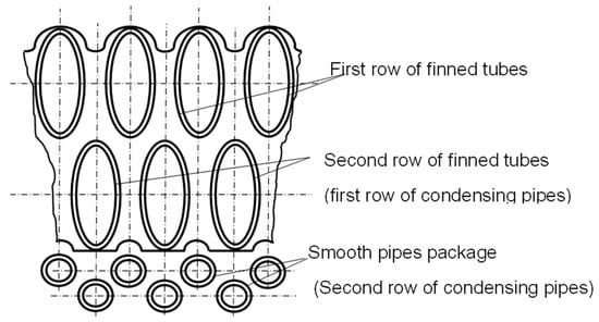 The furnace is represented by the volume between the premix plane surface radiation burner and the main finned pipes heat exchanger body. There are also lateral cooling pipes in the furnace, as presented in Figure 4. For the first convective finned pipes row, there is considered to be only heat transfer, due to the impossibility of draining the formed condensate. Considering its important thermal load, the first row is divided in two calculus sections: the upper part, and the lower part (also due to the fin geometry that differs between the two sections). The first convective body with condensation is the second row of finned pipes, and the second condensing body is the final plane pipes fascicle.