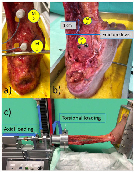 The figure shows in (a) the placed Zebris markers on the posterior malleolus (M1) and the distal tibia (M2), in (b) again the position of the markers M1 and M2 is shown, as well as the positioning of the M2 marker about 1 cm above the fracture level of the PM, and in (c) the test setup is shown with the lower leg clamped in the testing machine; the torsional loading was achieved by rotating the proximal tibia against the fixed foot.