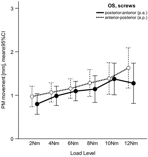 For the primary stability, the regression model (rmGLM) showed no significance for OS, (p = 0.378) at a medium effect size (η2p = 0.065). The movement of the PM tended to be marginally greater for the OS with a.p. screws than the OS with p.a. screws. The interaction effect showed with p = 0.691 and a small to medium ES (η2p = 0.049), no significance, and, thus, no superiority of either OS. The trend was quasi parallel for both OS. The 95% confidence interval (Figure 3) illustrates for both sides that the movement increases as the load level increases (p = 0.001). However, the lower and upper limits of the 95% confidence intervals of the two OS overlap at all load levels.