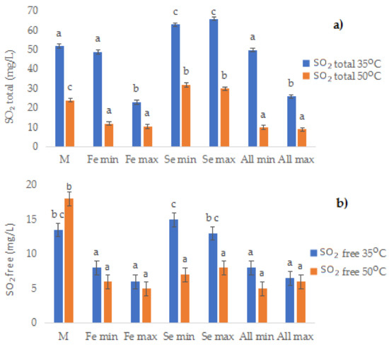 Total (a) and free (b) SO2 content (mg/L) of the samples after 12 days of heating at 35 and 50 °C. Different letters at each temperature studied indicate statistically significant differences (p < 0.05). Sample codes are described in Table 1.