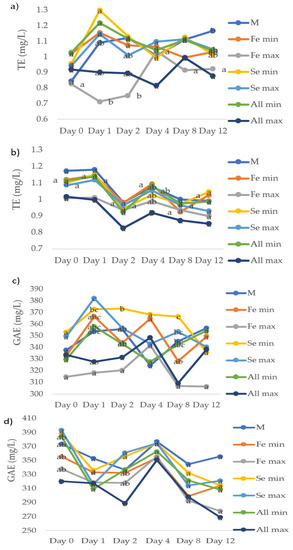 Change of antioxidant activity (TE mg/L) (a,b) and total phenols (c,d) GAE (mg/L) of the samples during 12 days of heating at 35 and 50 °C, respectively. Different letters at each temperature studied indicate statistically significant differences (p < 0.05). Sample codes are described in Table 1.