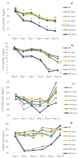 Figure 4c,d shows the evolution of total hydroxycinnamic content (HC) during heating time. As it can be observed, there was no clear trend regarding concentration change. In samples with absence or low contents of Fe2+ and H2O2, an increase of HC after the heating period was noted at both temperatures. This might have been probably due to the acceleration of the hydrolyzation reactions which took place during heating. These results are in agreement with the findings of other studies where the concentrations of hydroxycinnamic acids increased significantly with time [26,49]. However, in the case of the samples with high Fe2+ and H2O2 contents, HC content did not show a similar increase and was significantly lower than that of the rest of the samples. The abundance of the strong oxidants probably resulted in condensation reactions involving these compounds. In addition, it was interesting to note that in samples with high contents of oxidants, a sharp decrease of HC content was observed (at day 1 at 50 °C and at days 1 and 4 at 35 °C). This decrease might have been due to oxidation of these compounds, since together with flavanols they are considered the most susceptible to oxidation due to the catechol moiety in their structure [5]. However, afterwards, their content was increased gradually, probably due to the simultaneous presence of flavanols which are the primary oxidation substrates and probably more actively participated in the oxidation process, thus limiting oxidation of other compounds. The presence of Se at 35 °C seems to have retarded the initiation of this process, since the highest decrease in HC was observed after four days, while in the sample without Se addition, this occurred much faster (day 1).
