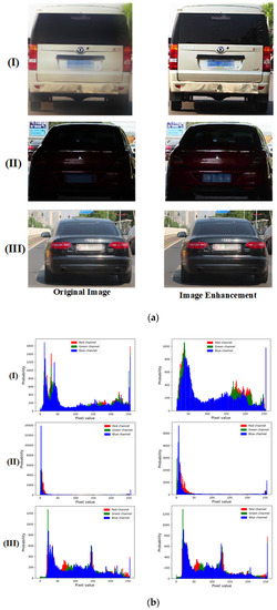 As shown in Figure 3, we select three representative image enhancement results, images under normal lighting, dark lighting, and strong lighting conditions. As shown in Figure 3a, the comparison reveals that the images in the original CTSD data are not uniformly illuminated but are locally unclear and, therefore, not easily detected and recognized. As shown in Figure 3b, after the adaptive image enhancement, the overall RGB histogram distribution becomes more uniform [40], logos appear prominent, the images’ contrast and brightness are significantly improved, the images’ details are outstanding, and the original image quality is preserved, thus conducive to logo detection and recognition and thus meeting the requirements of vehicle logo detection in this study [41].