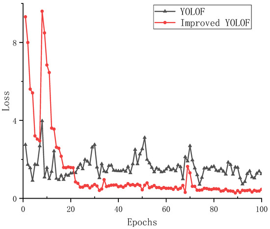 As shown in Figure 4, the classification accuracy of the improved YOLOF model is boosted by more than 10% compared to the original YOLOF model. As shown in Figure 5, the loss function of the improved YOLOF model is lower and more stable than the original YOLOF model.