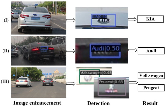 Overall, by enhancing the loss function model, the improved YOLOF model proposed in this study can boost the detection efficiency and accuracy in vehicle logo detection compared with the original YOLOF model. As shown in Figure 6, the road images acquired under complex lighting conditions are first processed using image enhancement techniques, and then the images are detected using the improved YOLOF network, and finally, the moving vehicle logo results are obtained. The experimental results show that our proposed method can effectively accomplish the recognition of car markers under complex lighting conditions.