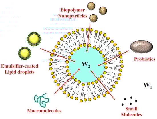 Incorporation of different hydrophilic bioactive agents into the hydrophilic interiors (W2) of liposomes [66].