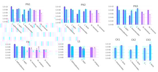 Regarding the bacterial composition, Lactobacillus, specifically L. kefiranofaciens was the most abundant bacterium in all five traditional kefir grains, accompanied by the genus Lentilactobacillus (Figure 2A). In the beverage fraction of traditional kefirs, L. kefiranofaciens also showed the highest relative abundance among bacterial species in kefirs FN and LS, while L. lactis showed the highest relative abundance in kefirs PN1, PN2 and PN3. Unlike the grain-based kefirs, Lactococcus spp. were the dominant bacterial genera in all three commercial kefirs (Figure 2B), besides a lower abundant population of Leuconostoc spp. in kefir CK3 and Leuconostoc spp. and Streptococcus (S.) thermophilus in kefir CK1. Regarding the beverage fraction, a considerable difference in the bacterial population was observed within traditional kefirs. Although the majority of studies have shown the prevalence of L. lactis and L. mesenteroides in kefir beverages [8], the highest abundance of L. kefiranofaciens was surprisingly observed in the beverage fraction of kefirs FN and LS, detected using both targeted qPCR and untargeted NGS.