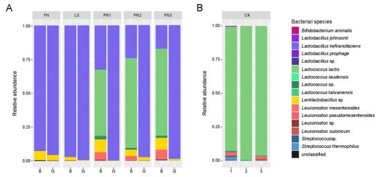 Diversity of bacterial species in (A), traditional kefirs FN, LS, PN1, PN2, PN3 in grains (G) and beverages (B) after 47 ± 1 h of fermentation and (B), commercial kefirs (CK1 = Brandenburg, CK2 = Müller, CK3 = Andechser Natur).