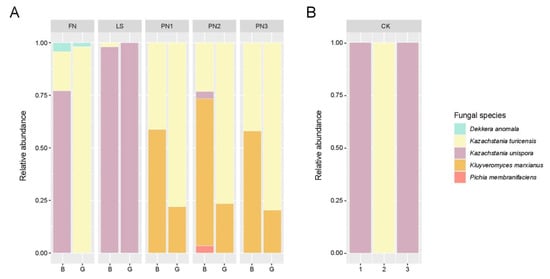 Diversity of fungal species in (A), traditional kefirs FN, LS, PN1, PN2, PN3 in grains (G) and beverages (B) after 47 ± 1 h of fermentation and (B), commercial kefirs (CK1 = Brandenburg, CK2 = Müller, CK3 = Andechser Natur).