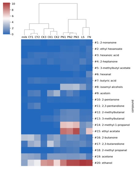 Hierarchical cluster analysis for VOCs analysis of commercial yogurt (CY1 and CY2), commercial kefirs (CK1, CK2, and CK3) and grain-based kefirs (LS, FN, PN1, PN2, and PN3), showing the peak volume (abundance) of each substance. The grain-based kefir was analyzed after 47 ± 1 h of fermentation.