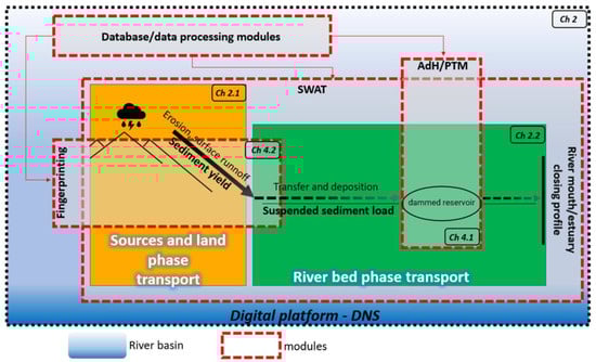 Simulation of stochastic and variable sediment transport processes within models still poses a big challenge, especially in mountainous areas. Since sediment transport, including erosion and deposition, remains an unceasing problem in many areas, sediment modeling is perceived as a possible solution. This article combines a review of the selected sediment models with a presentation of the effects of several years of research using the DNS digital platform in the Western Carpathians. The review focuses on the main advantages and gaps in selected modeling tools with particular emphasis on one of the most popular: SWAT. The description of the digital platform—DNS is an example of how to answer these gaps by combining subsequent models, methods, and databases using their best features. To accentuate the benefits of such an approach, the effects of combining subsequent models (AdH/PTM) and methods (fingerprinting) on a common digital DNS space are presented, on the example of the Raba River (basin). In this way, both unique possibilities of estimating the amount of contamination carried with sediment particles and their sources, as well as sequencing of sedimentation in the reservoir, taking into account its subsequent zones, were obtained.