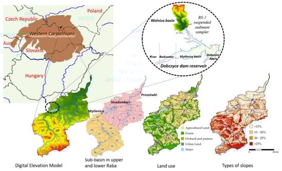 Over the last 15 years, there has been a dynamic increase in the use of computer applications, as evidenced by the number of articles on qualitative modeling published in scientific journals during this period, which has exceeded more than 3000 [21]. A rapid development of mathematical tools occurred and with it, this field of knowledge also created new possibilities for research on the transport of sediments. Currently, a wide range of sediment models are available, which differ in complexity, accuracy, inputs and outputs, approaches, and their spatial and temporal scales, which can be broadly classified as empirical (e.g., USLE, RUSLE, TMDL), conceptual (e.g., HSPF, AGNPS, SWAT), physical (e.g., KINEROS, MIKE-SHE, WESP), and hybrid (e.g., IHACRES-WQ, SEDNET) [3,22]. The achievements of these models in simulating sediment yield and sediment load are at least satisfactory (e.g., [23,24,25,26,27,28]). Nevertheless, the possibilities of considering the high affinity of fine-grained sediment fractions (<63 μm) with pollutants (e.g., heavy metals and nutrients) are still limited [29]. As a consequence, even the most advanced models often make it impossible to identify the sources of sediment within the basin [30], and to predict the risk of increased levels of pollution in rivers and water bodies [31,32,33,34,35]. Difficulties also exist in basins with a dam reservoir, which together constitute an integral dynamic system with deep interactions. These two elements of the basin area are usually studied using tools operating at different spatial and temporal scales, often treating them as separate units, or largely generalizing the relationships between them. The best solution to these problems seems to be the integration of both individual models as well as methods and databases. The primary goal of such integration is to combine fragmented knowledge to strengthen the ability to rigorously assess hypotheses and system responses in dynamic scenarios [36]. Model integration is usually difficult and limited by specific model code as well as formats and data exchange between models. Despite these difficulties, attempts have been made to make such connections. They often relate to extending the potential of models such as SWAT (Soil and Water Assessment Tool) [37,38,39], which is one of the highest rated tools in terms of water-quality modeling on the basin scale [21]. Until now, SWAT has been combined with models such as UCA2D-SCILA [40], EFDC [41], SOBEK [42], CLUE-S model [43] or HSPF [44], and methods such as remote sensing and image analysis—OBIA [45] or fingerprinting [30,46]. The combination and use of the best features of the available tools, grouped in one digital space, therefore seems to be an opportunity especially for mountainous areas, which are more difficult to model and particularly vulnerable to soil loss, such as the Western Carpathians. This area is one of the important soil erosion “hot spots” in Europe [47,48,49,50], and covers the area of Slovakia and Poland, as well as parts of the Czech Republic, Hungary, and Austria. The Western Carpathians were characterized by dynamic changes which today have a significant impact on both the land and the riverbed phases of this area. A strong drive to use the riverside land in agriculture and to protect the valleys against floods meant that from the second half of the 20th century, extensive regulatory work was carried out in the Polish part of the Western Carpathians, which consequently led the river to become much narrower, simpler, and shorter [51]. The result of this man-made process was a significant increase in riverbed erosion [52,53,54]. Moreover, the transformation of the centrally planned economy into a free market economy, which took place in 1989, resulted in a decrease in the profitability of agricultural production and its successive replacement with forested areas, thus limiting water erosion and surface runoff in the land phase [48,55]. For several years, attempts have been made to track the sediment transport in this area in both phases of the river basins. Erosion and sediment yield analyses focused on the use of both the digital elevation model (DEM) [56], commonly known empirical models (e.g., Universal Soil Loss Equation—USLE and its modifications MUSLE and RUSLE) [52,57], and more advanced environmental models, such as SWAT [58,59]. It is much more difficult to find examples of the use of models to simulate sediment transport in the riverbed phase. Earlier analyses of sediment transport in this area for this phase were mainly based on the results of in situ research [19,60,61,62].