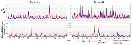 Comparison of the simulation to the observed results for the calculation profile of Myślenice and Proszówki for flow and suspended sediment.