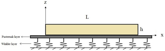 Hereafter, we consider a beam embedded on an elastic medium, as depicted in Figure 1, accounting for a Pasternak coefficient, , as a shear layer and a Winkler coefficient, , as normal layer. The elastic foundation is generally defined by using the stiffness coefficient and power-law distribution function as [37].