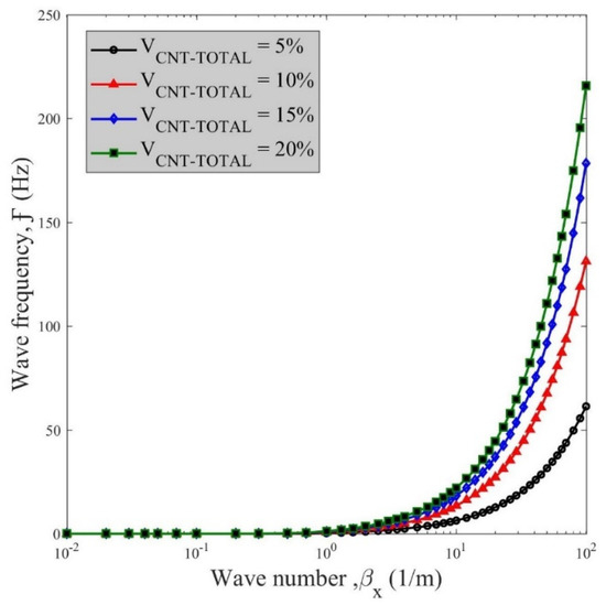 Wave frequency vs. wave number for various volume fractions of CNTs.