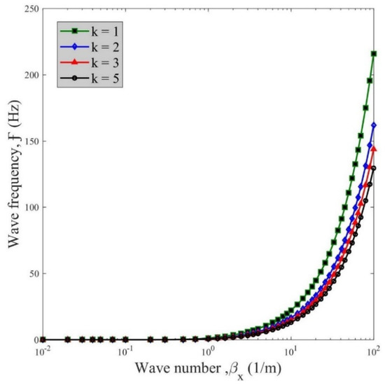 Figure 4 and Figure 5 describe the variation of wave frequency and phase velocity versus the wave number for different CNT grading power terms at a fixed . Based on these plots, for high wave numbers, the influence of the power term is much more significant, where the power term plays a decreasing role in the variation of wave frequency. In both figures, the wave frequency and phase variation decrease for an increased power term, and a fixed wave number, due to a softening influence of the power term along with an overall increase in the structural deformability.