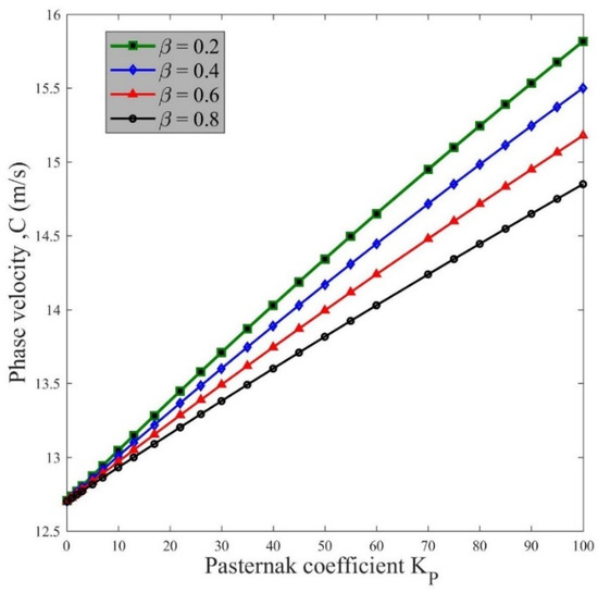 Figure 6 also shows the effect of the Winkler coefficient on the wave frequency for a different coefficient , here varied from 0.2 to 0.8, under the assumption , . When the structure is supported by a foundation, the structural stiffness increases monotonically with , since the wave frequency gets higher values for an increased Winkler coefficient, especially for lower values of the coefficient . Another important parameter for structures on an elastic foundation is represented by the Pasternak coefficient in the shear layer. Figure 7 shows the influence of this parameter on the phase velocity, while varying the coefficient from 0.2 up to 0.8. It is worth noticing that an increased Pasternak coefficient yields higher phase velocities for each selected , whereas the phase velocity becomes smaller by increasing the coefficient from 0.2 up to 0.8 under the same Pasternak coefficient assumption.