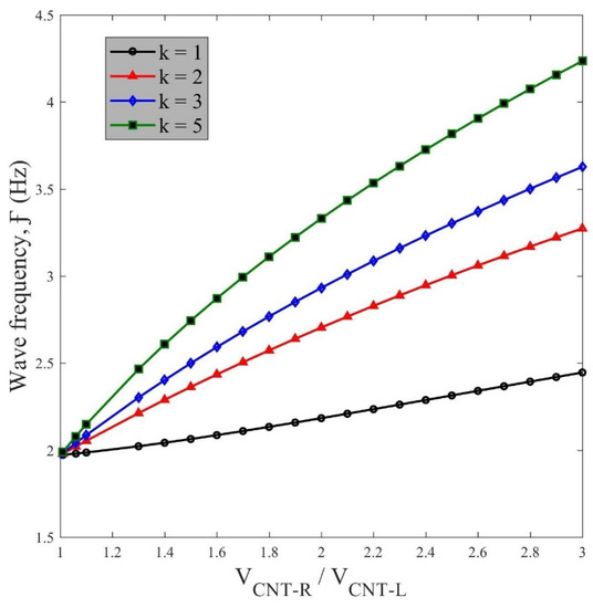 - The CNTs volume fraction at both sides of the beam, has a meaningful influence on the wave propagation. The volume fraction at the left side of the beam () and the ratio has a hardening effect on the structure, with an improved response in terms of wave frequency and phase velocity.