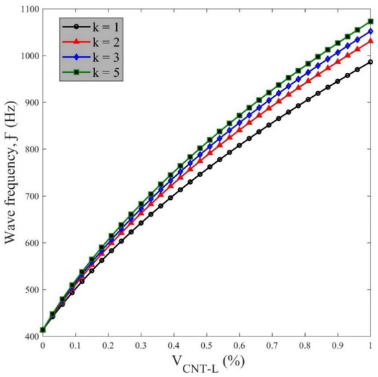 In this section, we study the sensitivity of the wave frequency and phase velocity to different input parameters that could serve for design purposes of many high-tech devices made of advanced CNT-reinforced composite materials, and further computational studies on the topic. We start the analysis by accounting for the mechanical properties of the constituent materials in Table 1 for FG CNTs-reinforced composites, while validating the proposed methodology with findings by Loy [38] from literature. Table 2 summarizes the results in terms of dimensionless natural frequency for a simply-supported structure and different wave numbers, with a good correspondence between results based on our model and those once from literature. One of the critical aspects for such structures, relies on the influence of the CNT distribution in the length direction. To this end, we plot the wave frequency vs. the wave number for various CNTs volume fractions, while keeping fixed and , as visible in Figure 2. For low wave numbers, up to the unit value, any variation in the wave frequency is noticed, after which a monotonic increase of wave frequency occurs for increased values of wave number. This behavior is even more pronounced for an increased volume fraction of the reinforcing phase. For a constant wave number, indeed, an increased volume fraction of CNTs gets higher values of wave frequency. A further investigation accounts for the influence of the volume fraction of CNTs and wave number on the phase velocity of the structure, as plotted in Figure 3. Note that for small wave numbers up to 0.1, the volume fraction does not affect the phase velocity, with a meaningful variation in the response for higher wave numbers in a non monotonic sense, both in the ascending and descending branches of the plots. Small variations in the volume fraction of CNTs within the range 0.1 and 10, enable a severe additive effect on the phase velocity, where the structure gets stiffer.