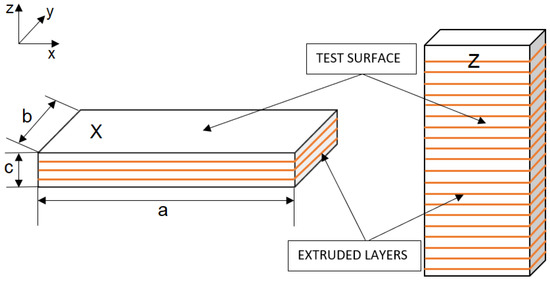 The sample preparation experiment was conducted using two types of thermoplastic layer extrusions, with five deposition strategies in terms of individual fibers’ orientations. Three identical samples were made for each fiber type and orientation, for a total of 30 samples. The samples were block shaped, each with a size of 70 × 20 × 6 mm (a × b × c) (Figure.1) and the contact surface in contact with the rotating disc was a 70 × 20 mm wall of the sample that was compatible with the tribometer sample holder. The extruded samples were all 6 mm thick. The samples marked with an X were printed in the horizontal direction, while samples marked with a Z were printed in the vertical direction (Figure 1).