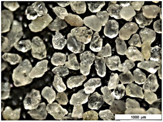 The three-point abrasive process involved free particles that can move freely (the abrasive). The testing procedure used garnet abrasive (AFS 50–70) with a particle size of 200 micron, as specified in the norm ASTM G65-16. The composition of the abrasive used is given in Table 3. Figure 3 shows a snapshot of the structure of the abrasive used.