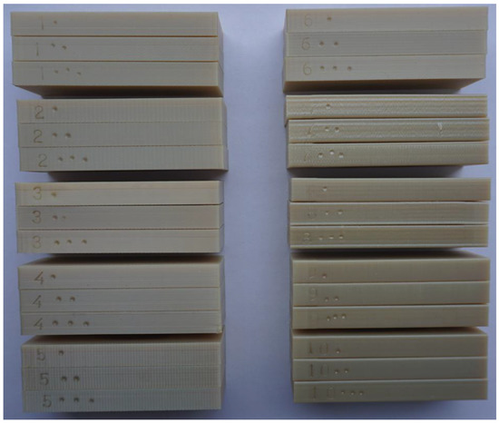 The first column of the two strategies (marked in red) corresponds to the odd layer deposited by the FFF technique, and the printing process also finished with this layer. Thus, the column on the right shows the evenly printed layers at the beginning of the printing process. As we can see, Samples 2, 3, 4, 7, 8, and 10 have the same fiber orientation in all deposited layers, whereas the fiber orientation of the layers in Samples 1, 5, 6, and 9 is alternating (Table 4). The samples used in the experiment are shown in Figure 5.